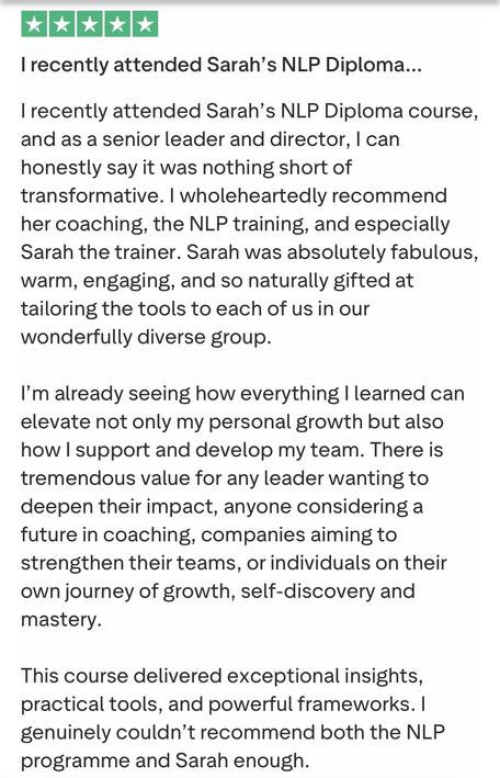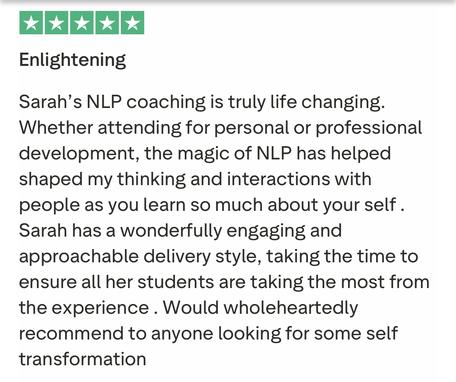 It’s been absolutely WOW. Sarah is the absolute MASTER and it’s opened me up to a whole new world . I cannot recommend enough to train in NLP with Sarah . She’s the ABSOLUTE BEST and I’ve been humbled and honoured to have the opportunity to be trained by her..”